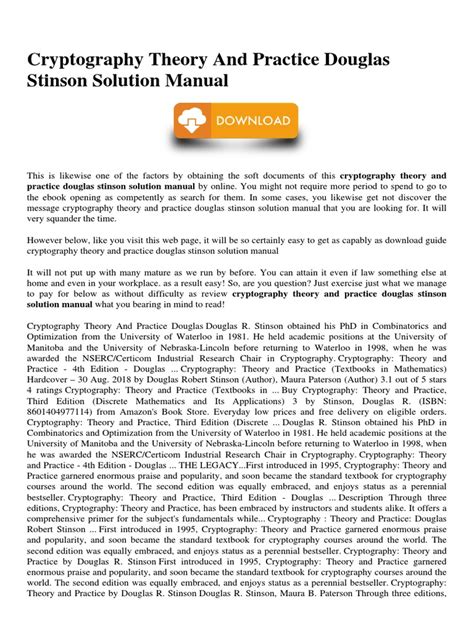 Read Online stinson cryptography theory and practice solution manual Epub By Click Button. stinson cryptography theory and practice solution manual it’s easy to recommend a new book category such as Novel, journal, comic, magazin, ect. You see it and you just know that the designer is also an author and understands the challenges involved with having a good book. You can easy klick for detailing book and you can read it online, even you can download it